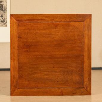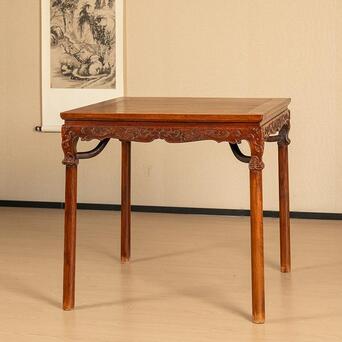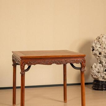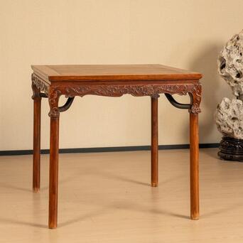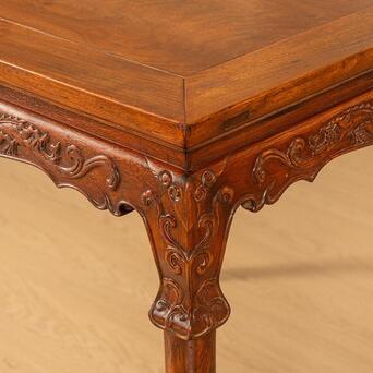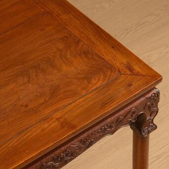 此品方桌比例周正,桌面攒框,板芯宽材,用料颇丰,边抹圆润,虽由上至下逐渐内收,但仍饱满宜人,下压一道细直边线,窄束腰、下接壸门牙板,上雕螭龙卷草,龙首神情飞扬,怒目圆睁龙角昂扬,鬃毛随风舞动,身姿矫健,延展至两侧桌角,布局疏密合理,细致宜人。两侧腿足上方下圆,详略得当,不显赘余或单调,高挑挺拔,巍峨如山。